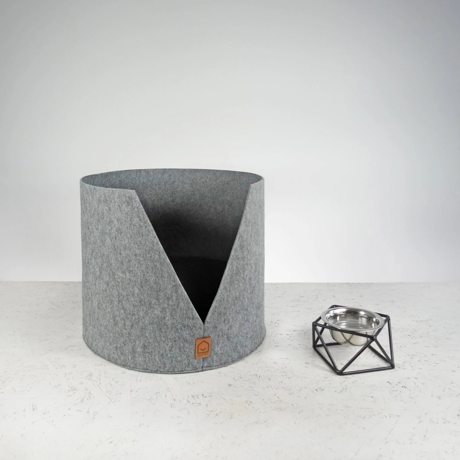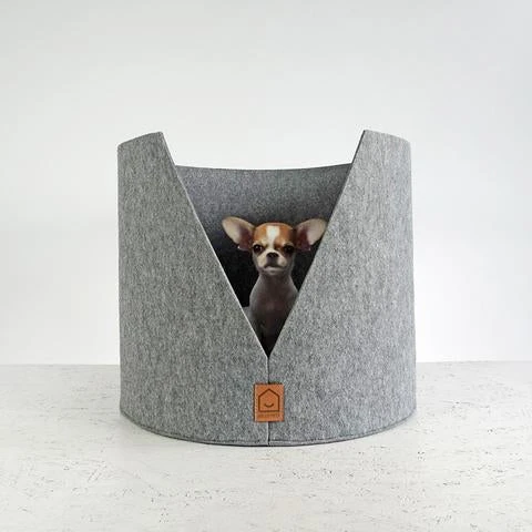 Lit pour chat ou petit chien en laine feutrée grise, avec un coussin noir très très moelleux qui se dé-housse pour être nettoyé.