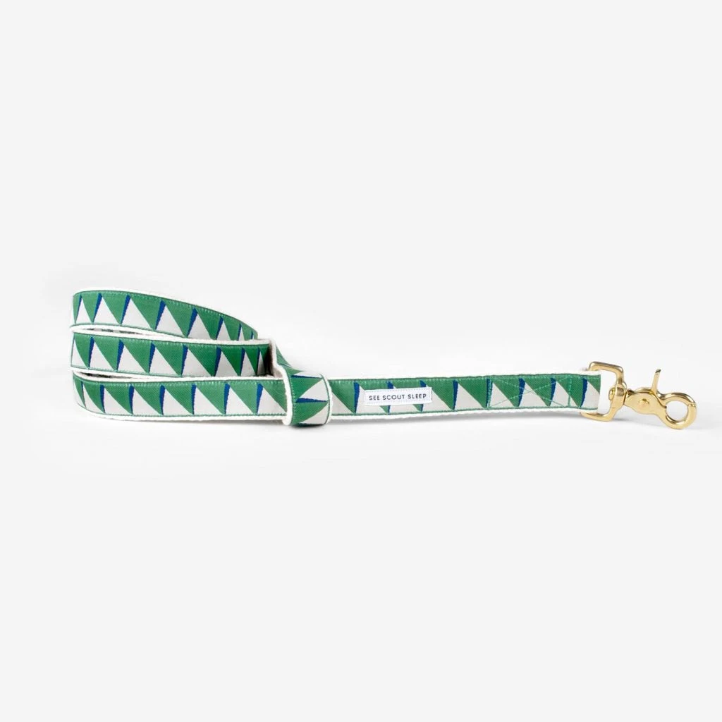 Laisse pour chien en chanvre vert émeraude, bleu et crème et en laiton ultra résistante.