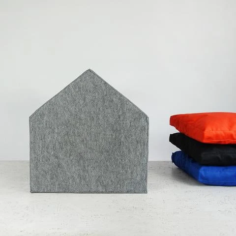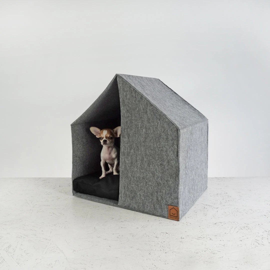 La maisonnette pour chien Hello Pets est parfaite pour s’isoler. Elle est fabriquée en laine feutrée grise, avec un coussin noir très moelleux qui se dé-housse pour être nettoyé.
