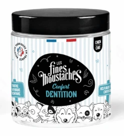 Le complément Confort Dentition de la marque LES FINES MOUSTACHES est un complément alimentaire naturel et complet pour une bonne hygiène bucco-dentaire des chiens et des chats.