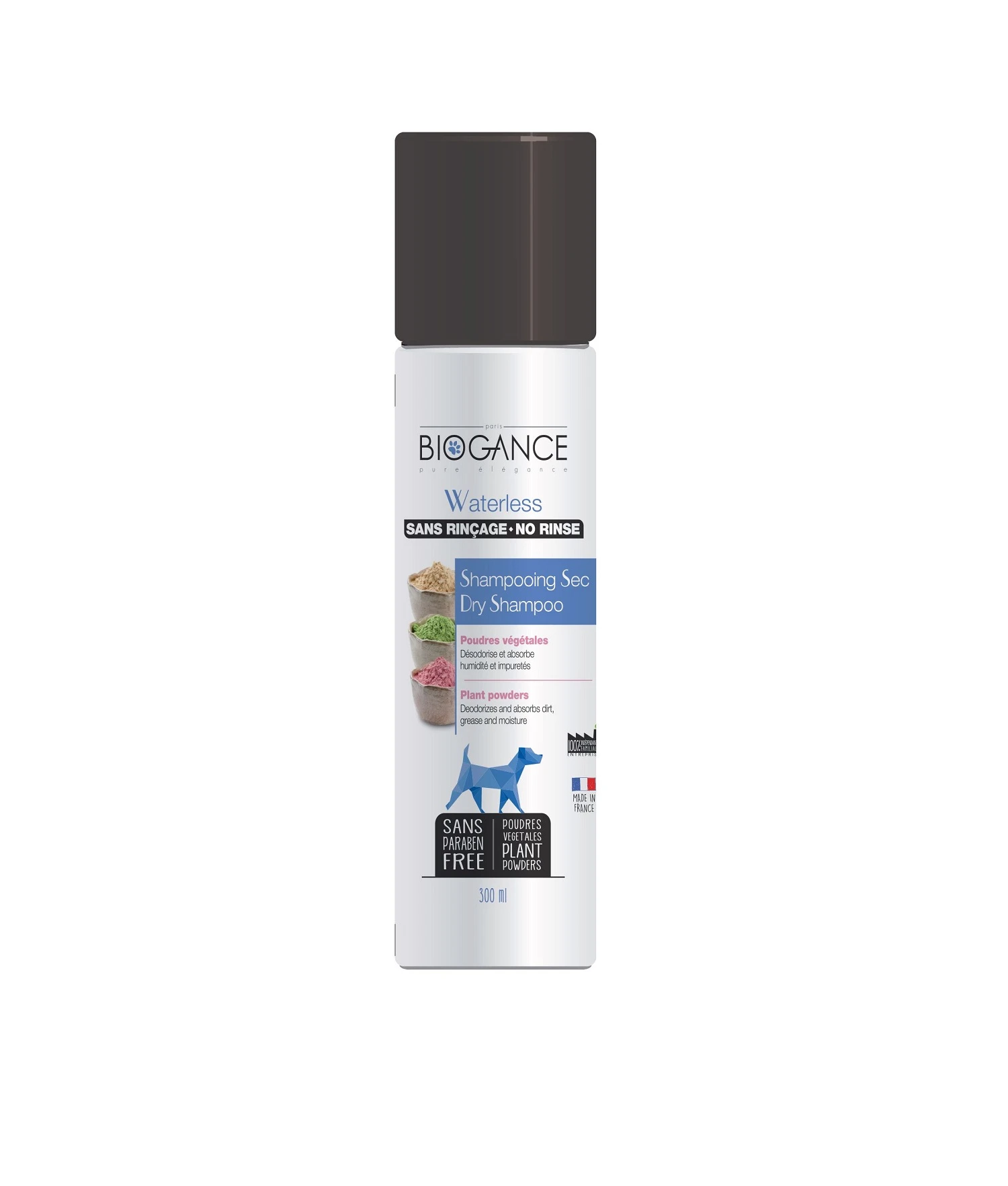 Grâce à son complexe naturel de poudre végétal, le shampooing sec Waterless Biogance nettoie sans rinçage, désodorise et dégraisse en douceur.
